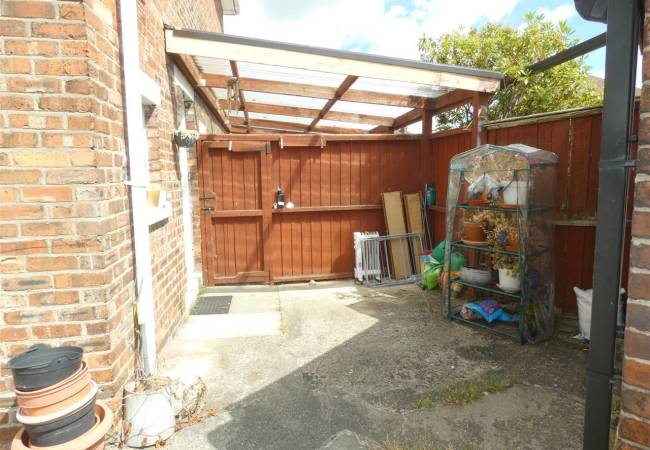 Side Side garden, laid to lawn with planted borders. Adjacent carport giving access to rear garden.