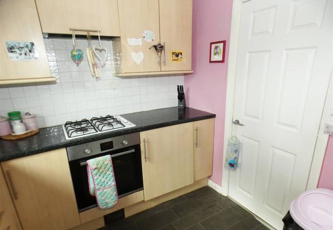 with a range of base and wall units, working surfaces, tiled splashbacks, built in oven and hob with extractor hood over, single drainer stainless steel sink, integral fridge, plumbing for washing machine, built in storage cupboard, window to the rear elevation and door to side.