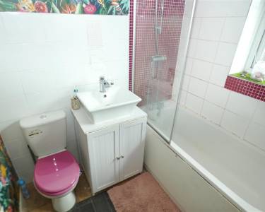 comprising of a three piece suite including panelled bath with shower attachment over, low level WC, wash hand basin, part tiled walls, heated chrome towel radiator, window to the rear elevation.