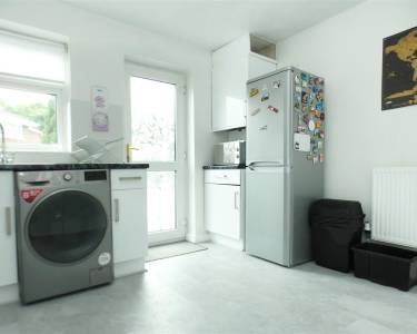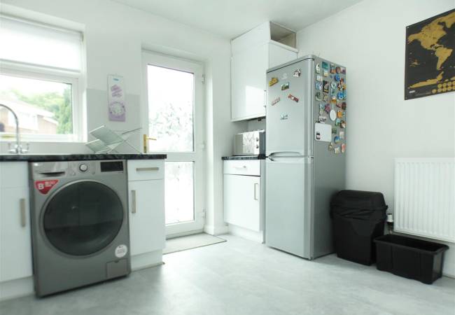 equipped with a matching range of base and wall units, working surfaces, single drainer stainless steel sink, built in oven and hob with extractor hood over, plumbing for washing machine, space for fridge freezer, tiled splashbacks, window and door onto rear garden.