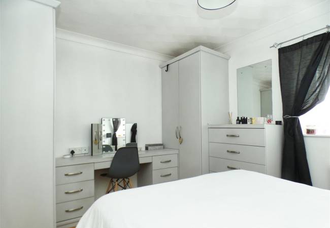 double room with a range of fitted wardrobes, drawers and dressing table unit, laminate flooring and window to the front elevation.