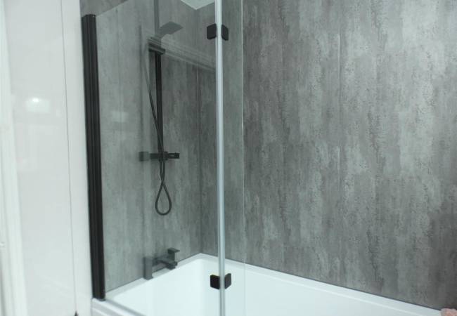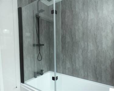 comprising of a modern three piece suite including shower bath with glazed screen and rainwater shower fitment over, vanity wash hand basin and built in low level WC, panelled walls, heated towel rail, laminate flooring and window to the side elevation.