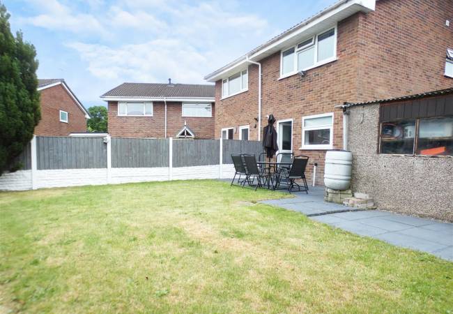 Rear Enclosed garden, laid to lawn with paved patio and covered walkway to the front.