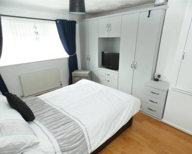 with a range of fitted wardrobes and drawers, built in cupboard, laminate flooring, access to loft space and window to the rear elevation.