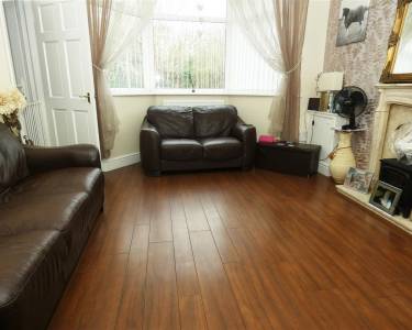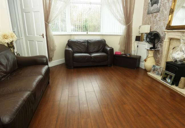 with feature fireplace, laminate flooring, understairs cupboard and bay window to the front elevation.