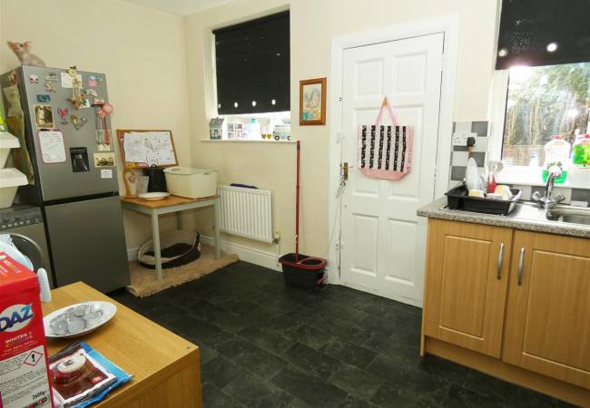 equipped with a matching range of base and wall units, working surfaces, single drainer stainless steel sink, built in oven and hob with extractor hood over, plumbing for washing machine, tiled splashbacks, two windows and door to the rear elevation.