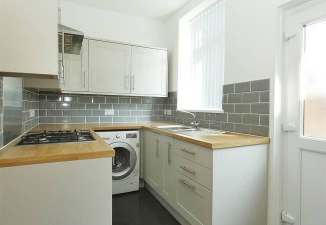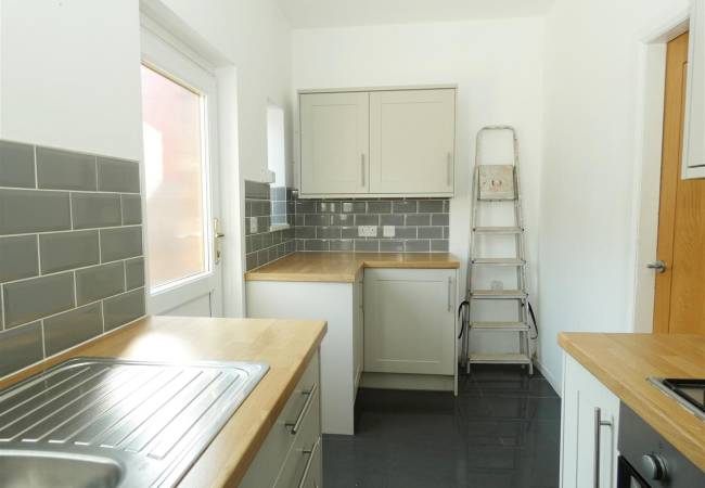 equipped with a matching range of base and wall units, working surfaces, 1.5 bowl stainless steel sink, built in oven and hob with extractor hood over, space for fridge freezer, tiled splashbacks, tiled floor, spot lighting, two windows and door to the rear elevation.