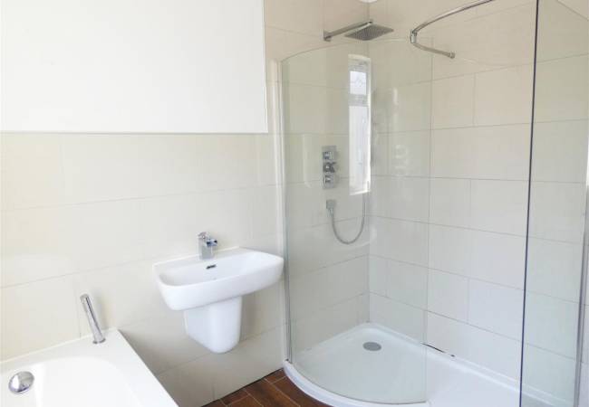 comprising of a four piece suite including panelled bath, shower cubicle with rainwater fitment, wash hand basin, low level WC, tiled floor, part tiled walls, heated chrome towel radiator, window to the rear elevation.