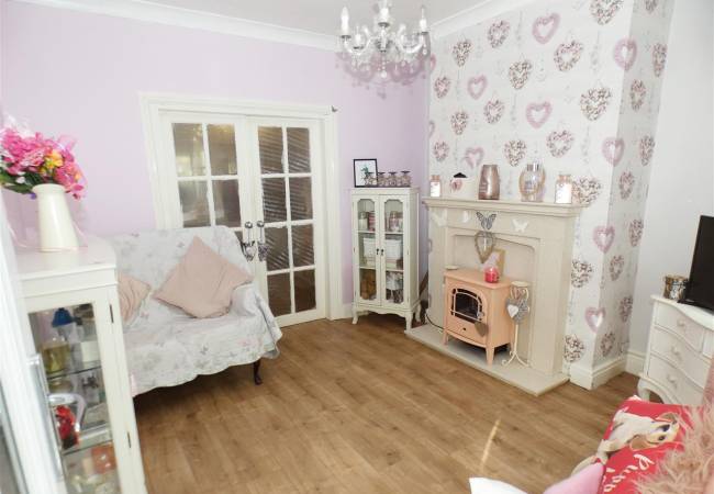 with feature fireplace, laminate flooring, window to the front elevation and double doors through to:-