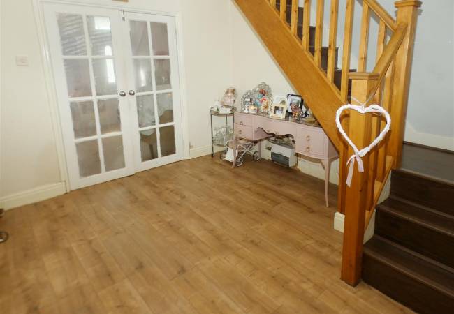 with laminate flooring, stairs to first floor and double doors through to:-