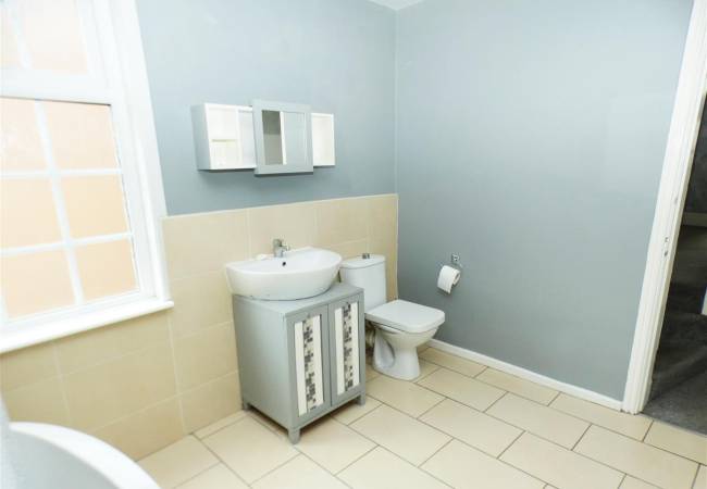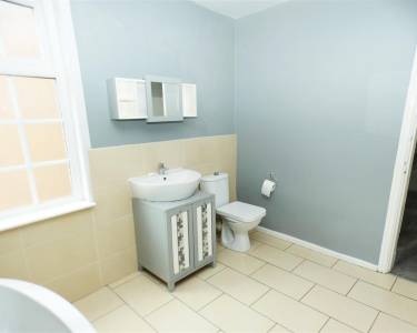 comprising of a three piece suite including free standing bath, vanity wash hand basin, low level WC, tiled floor, part tiled walls, heated chrome towel radiator, window to the side elevation.