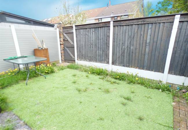 Rear Enclosed low maintenance garden area with artificial lawn.