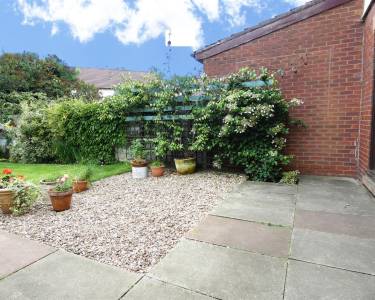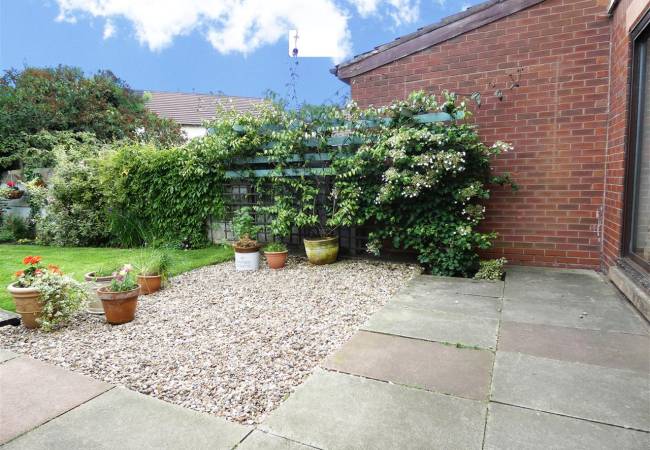 Rear Enclosed mature garden, laid to lawn with beds and borders and paved patio area.