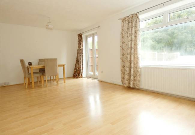with feature fireplace with gas fire, laminate flooring, window and French doors onto rear garden.