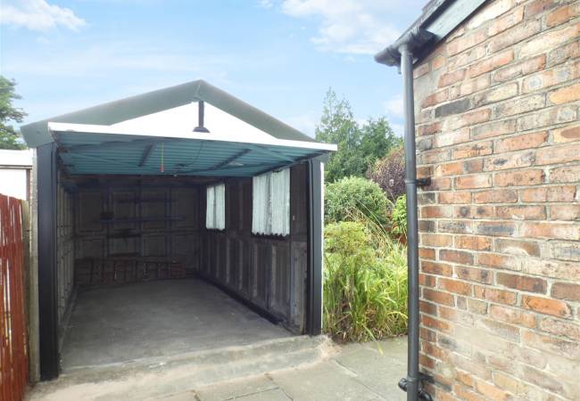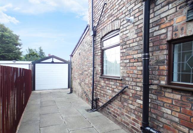 Block paved driveway providing off road parking with double timber gates giving access to detached garage.