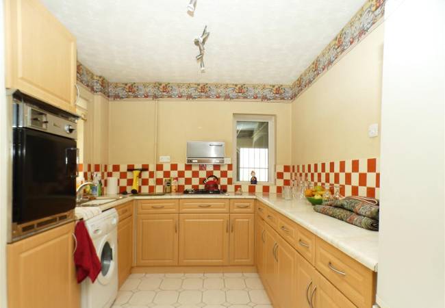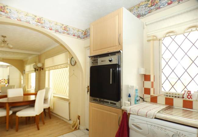 dining area with laminate flooring, window to the rear elevation and open arch to kitchen area equipped with a matching range of base and wall units, working surfaces, single drainer stainless steel sink, built in oven and hob, plumbing for washing machine, tiled floor, tiled splashbacks, window and door to the rear elevation.