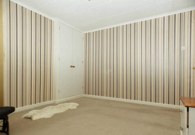 L-shaped room with built in wardrobes with mirror fronted sliding doors, window to the front elevation.