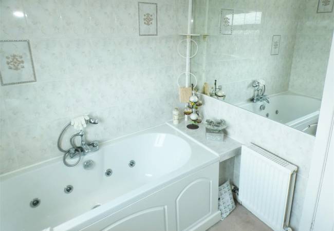 comprising of a three piece suite including Jacuzzi panelled bath, pedestal wash hand basin, low level WC, tiled walls, window to the rear elevation.