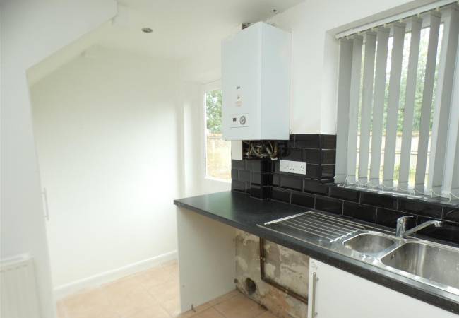 with a matching range of base and wall units, working surfaces, 1.5 bowl stainless steel sink, plumbing for washing machine, space for gas cooker with extractor hood over, tiled splashbacks, tiled floor, spot lighting, built in storage cupboard, window and door to the rear elevation.