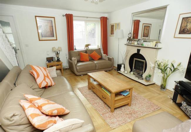 with feature fireplace incorporating living flame coal effect gas fire, wood flooring and stairs to first floor.