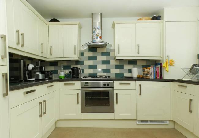 equipped with a matching range of base and wall units, working surfaces, single drainer stainless steel sink, built in oven and hob with extractor hood over, tiled splashbacks, integrated fridge freezer, washing machine and tumble dryer, space for table and chairs, window to the rear elevation and French doors to:-