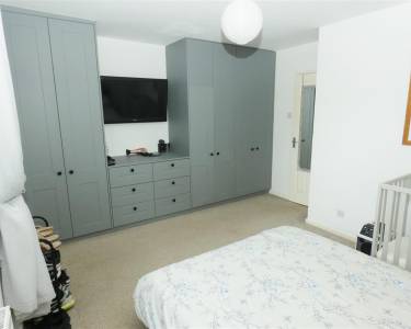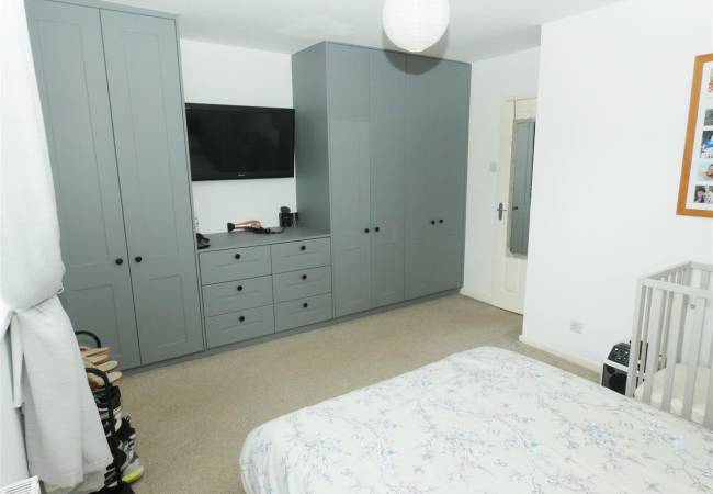 with a modern range of fitted wardrobes and drawers, window to the rear elevation.
