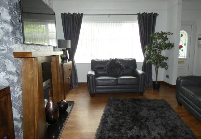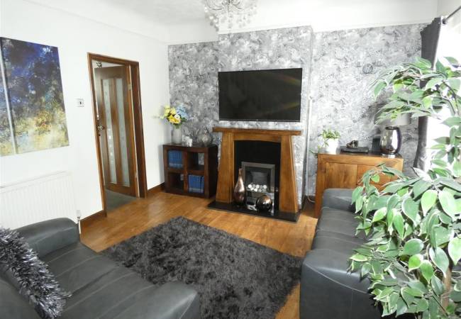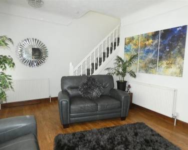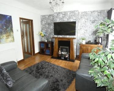 With laminate flooring, feature fireplace incorporating a pebble effect gas fire, picture rail to walls, staircase leading to the first floor and door with glass panels opening to the dining kitchen.