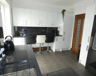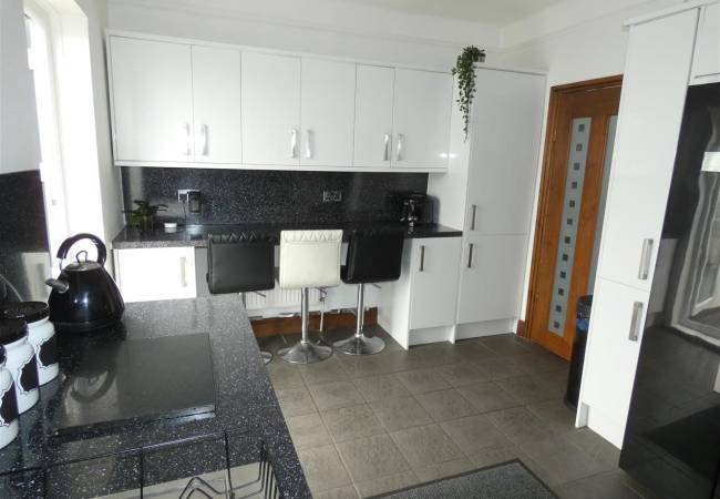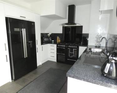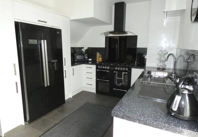 Fitted with a range of wall and base units with contrasting working surfaces including a breakfast bar. Space for a range cooker with chimney style extractor hood over, Plumbing for an American style fridge freezer, window to the rear elevation, tiled flooring and door leading to the conservatory.