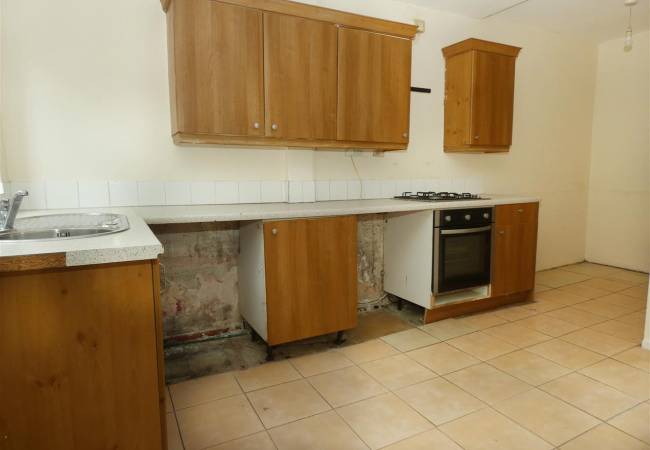 with a range of base and wall units, working surfaces, single drainer stainless steel sink, built in oven and hob, understairs cupboard, tiled floor, window and door to the rear elevation.