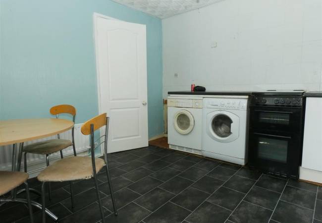 with a matching range of base and wall units, working surfaces, single drainer stainless steel sink, gas cooker point, plumbing for washing machine, part tiled walls, window to the front elevation.