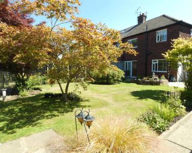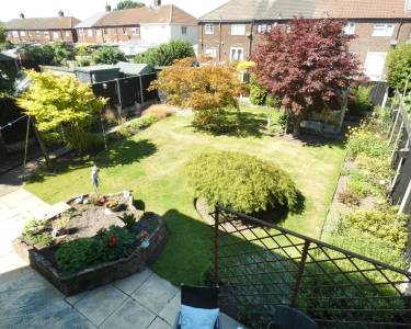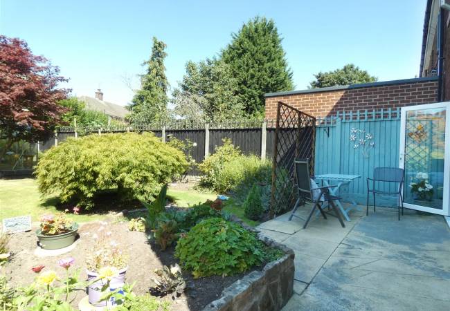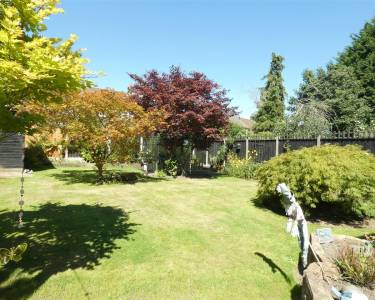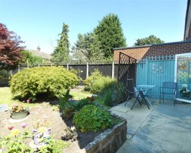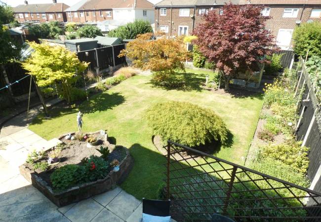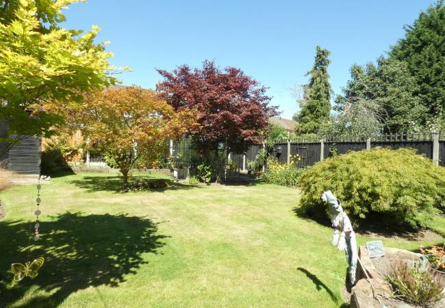 Rear Beautiful enclosed garden, laid to lawn with mature beds and borders, paved patio area, garden shed and greenhouse.