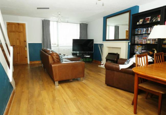 with feature fireplace, laminate flooring, dado rail, understairs cupboard and window to the front elevation.