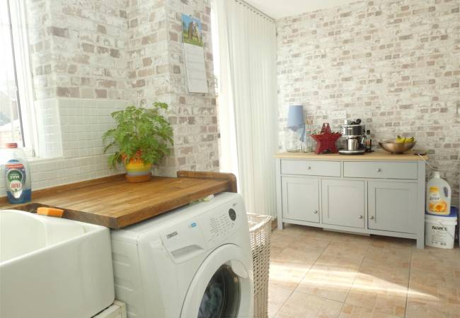 equipped with a matching range of base and wall units, butchers block working surfaces, Belfast sink, built in double oven and five burner gas hob with extractor hood over, space for American style fridge freezer, plumbing for washing machine, tiled splashbacks, tiled floor, spot lighting, window and French doors to the rear elevation.