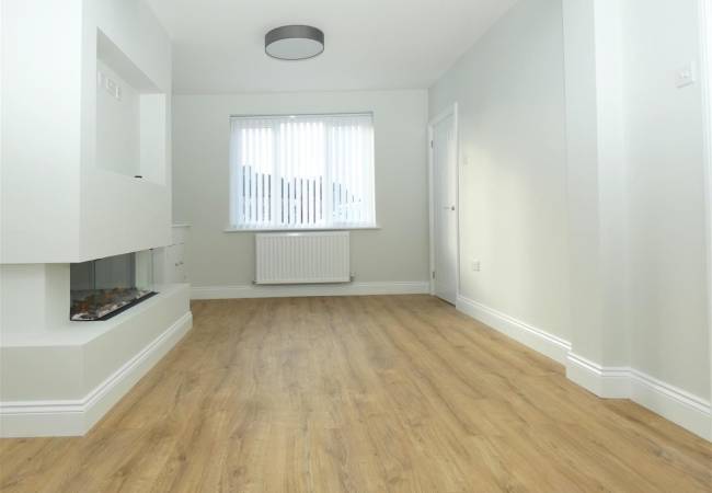 with modern feature living flame log effect fire with TV recess above, laminate flooring, window to the front elevation, French doors to rear garden and door through to:-