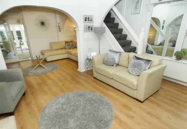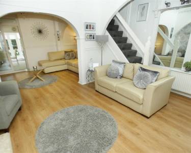 with feature fireplace incorporating pebble effect electric fire, laminate flooring, stairs to first floor and open arch through to:-