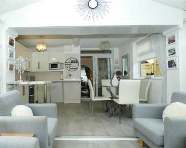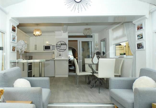 with dado rail, laminate flooring, wall light points and sliding patio doors through to:-