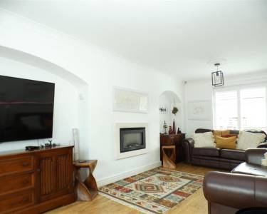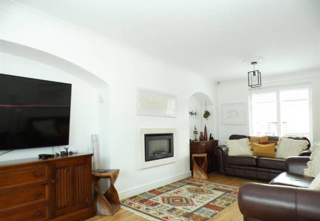 with feature pebble effect gas fire, laminate flooring, window to the front elevation and sliding patio doors onto rear garden, both with plantation shutters.