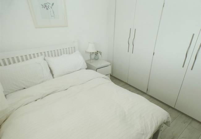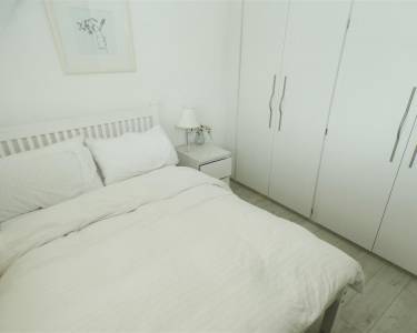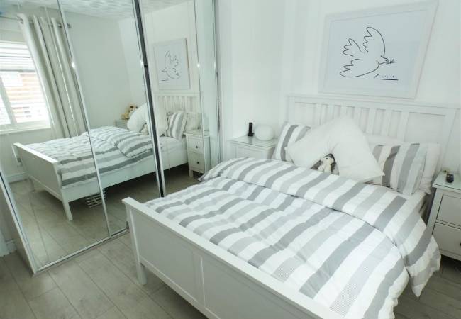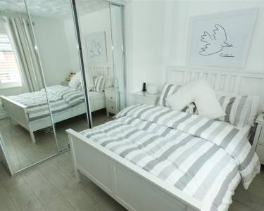 with a range of built in wardrobes with mirror fronted sliding doors, laminate flooring, window to the front elevation.