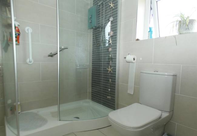 comprising of a shower cubicle, pedestal wash hand basin, low level WC, tiled walls and floor, window to the rear elevation.