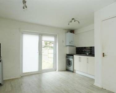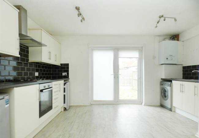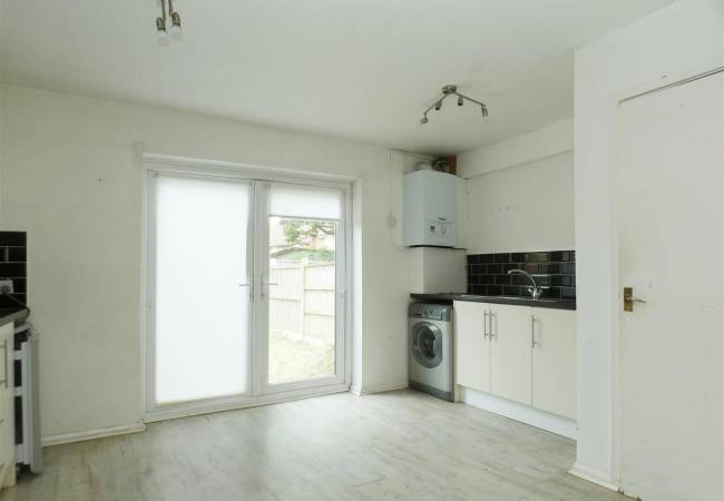 with a range of base and wall units, working surfaces, stainless steel sink, built in oven and hob with extractor hood over, tiled splashbacks, plumbing for washing machine, space for fridge and freezer, laminate flooring, French doors to rear garden, built in cupboard with door to:-