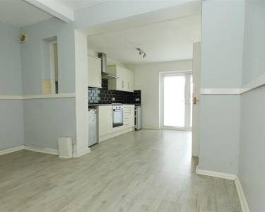 with laminate flooring, storage cupboard, dado rail and open through to:-