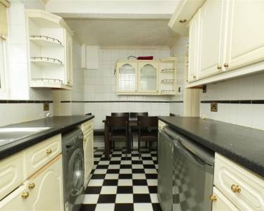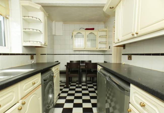 with a range of base and wall units, working surfaces, 1.5 bowl stainless steel sink, gas cooker point, plumbing for washing machine, space for fridge and freezer, space for table and chairs, window to the rear elevation.
