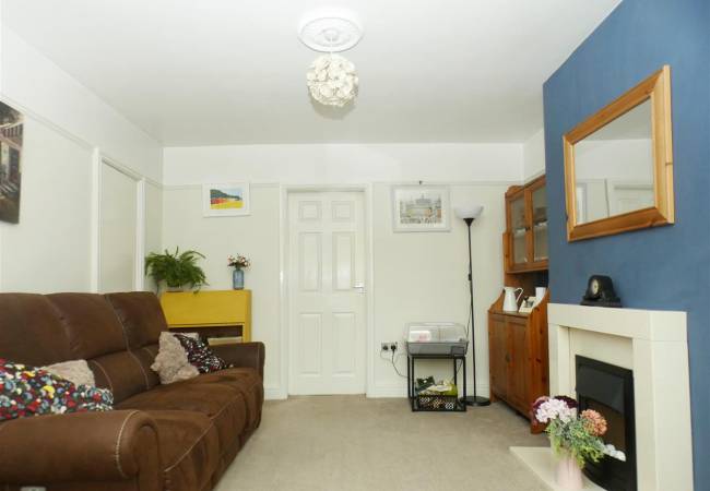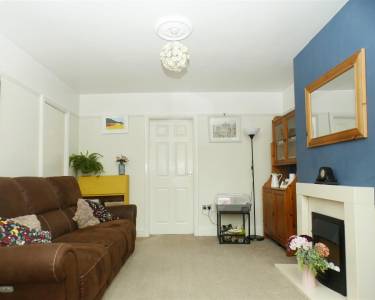 with feature fireplace incorporating pebble effect gas fire, understairs cupboard and bay window to the front elevation.
