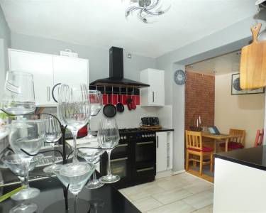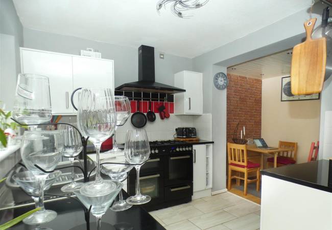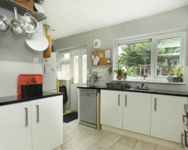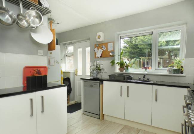 equipped with a matching range of base and wall units, working surfaces, single drainer stainless steel sink, space for range cooker with extractor hood over, plumbing for washing machine and space for fridge freezer, tiled splashbacks, tiled floor, two windows and door onto rear garden.