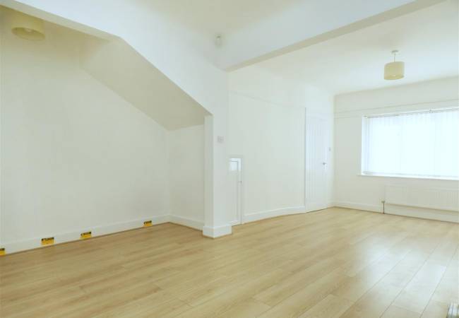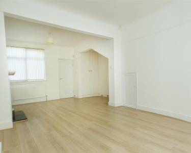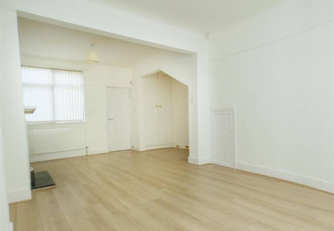 with fireplace recess, feature fireplace with electric fire, laminate flooring, understairs cupboard, built in storage cupboard, windows to the front and rear elevations.