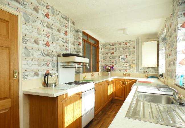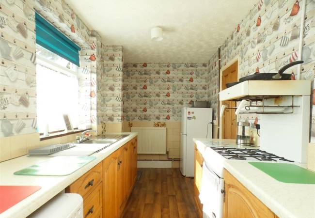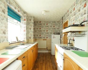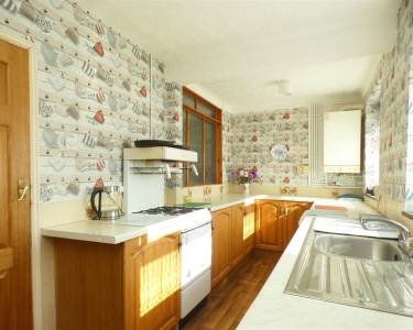 equipped with a matching range of base units, working surfaces, double drainer stainless steel sink, gas cooker point, plumbing for washing machine and space for tumble dryer, tiled splashbacks, two windows and door to the rear elevation.