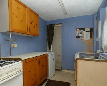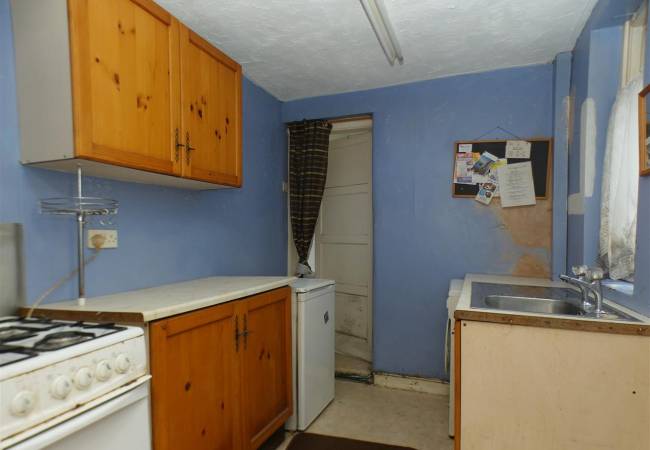 with base and wall units, working surfaces, single drainer stainless steel sink, plumbing for washing machine, gas cooker point, window and door to the side elevation.