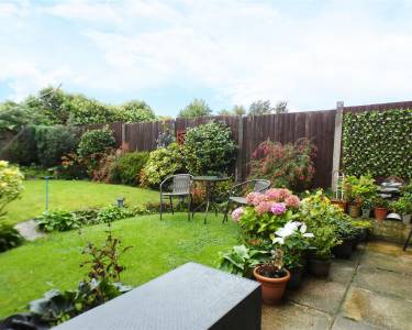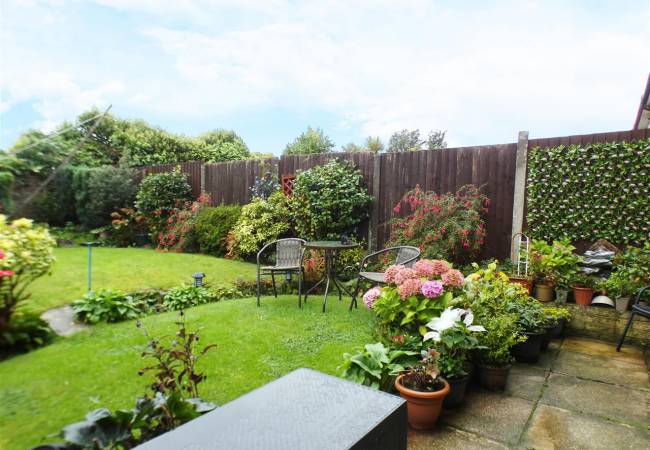 Enclosed mature garden, laid to lawn with beds and borders, paved patio area and timber shed.