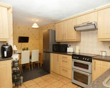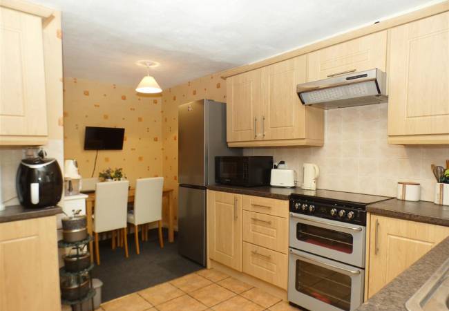 equipped with a matching range of base and wall units, working surfaces, 1.5 bowl stainless steel sink, gas cooker point, plumbing for washing machine, tiled splashbacks, tiled floor to kitchen area, space for table and chairs, window an door to the rear elevation.