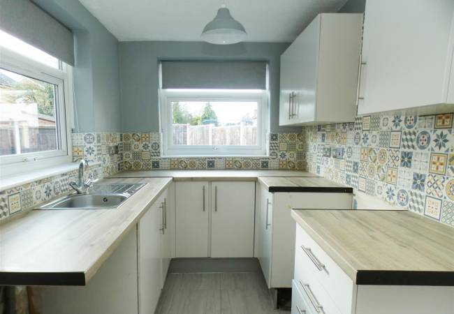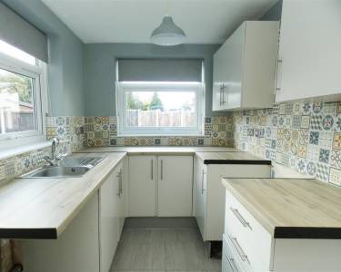 equipped with a matching range of base and wall units, working surfaces, single drainer stainless steel sink, gas cooker point, plumbing for washing machine, tiled splashbacks, space for table and chairs, tiled floor, windows to the side and rear elevations.